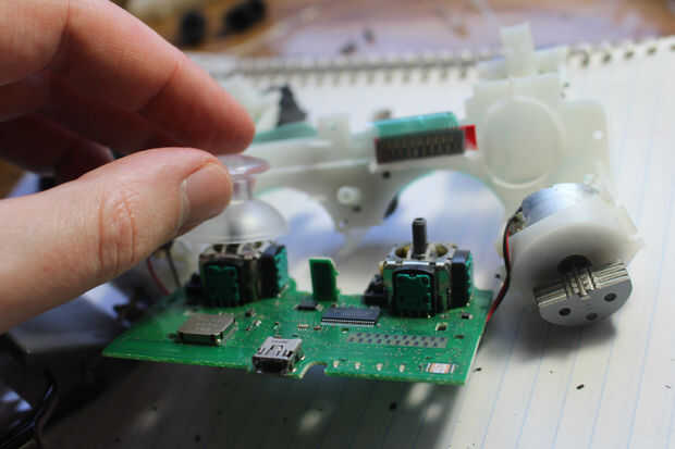 Usted querrá sacar cuidadosamente la carcasa plástico blanco de la placa así que usted puede intercambiar los thumbsticks. El viejo negro thumbsticks debe sacar sin demasiado alboroto y los nuevos sólo necesitan un empujoncito para ir a. No te preocupes realmente les obligan Usted puede empujar súper bien una vez que se vuelve a montar el regulador.