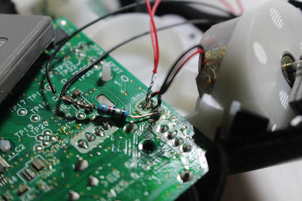 Alambre los extremos LED emparejados a los puntos en la placa donde se colocan los cables del motor de vibración. Se puede ver en las fotos que mi soldadura está realmente descuidado aquí, pero hace el trabajo muy bien. Sólo asegúrese de que al final, el LED cables mentira tan plano como sea posible, pero no tocar otros puntos de contacto en el controlador. Si se cablea el LED correctamente, negro debe ir a negro y rojo con rojo a cada lado. (la derecha en la foto aquí)