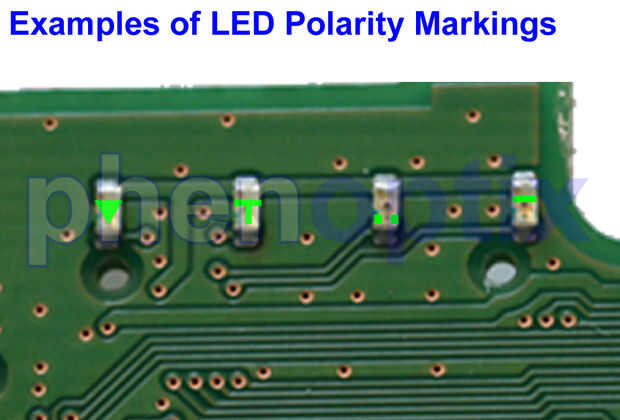 Si te fijas bien en el LED dará cuenta de que la polaridad se indica con una flecha verde o T situado en la parte inferior del LED.