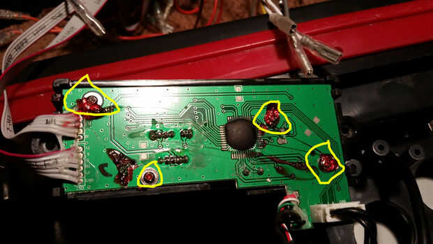 Ahora se desatornilla los tornillos marcados. Se debe eliminar la mugre roja para Desenroscar completamente cada tornillo.