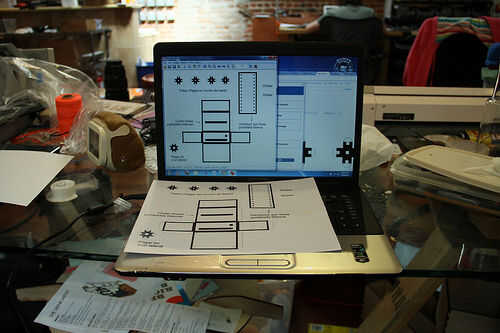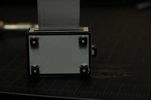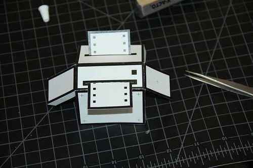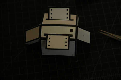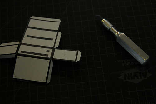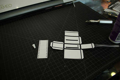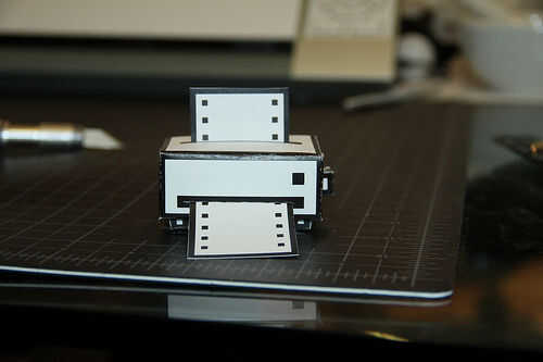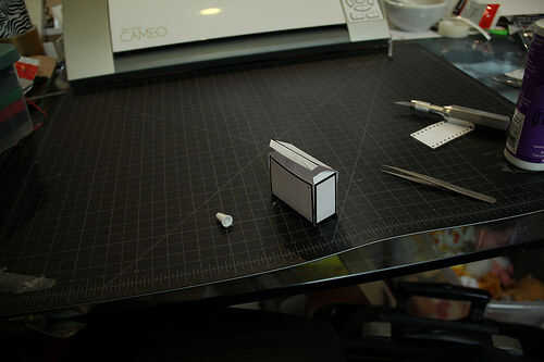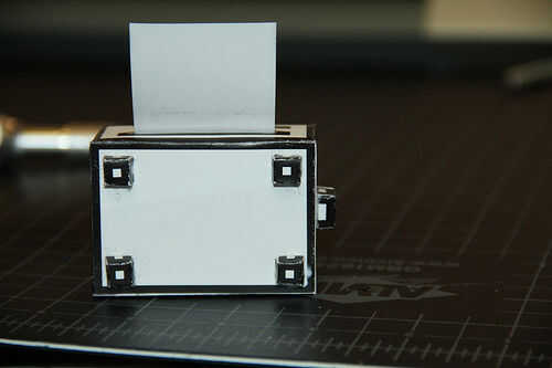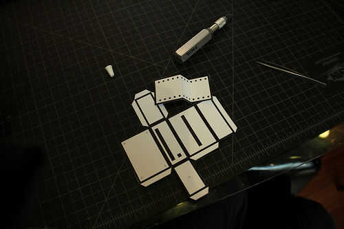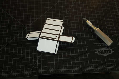 El modelo para esto viene de feed de Flickr extensa de Papel Continuou: http://www.flickr.com/photos/papelcontinuo/44633014/ es un modelo simple pero increíblemente lindo y debe tomar cualquier papercrafter calificado sólo 5-10 minutos.  Es bastante mucho todos los cubos geométricos (rombo!) y es bastante simples plazas. La parte difícil sólo parcialmente es la boca, ya que tienes que usar un cuchillo Xacto lindo en boca y parte superior del cuerpo para avanzar el papel a través de.  Sugiero esta sección de corte y alimentación de papel a través de antes de que pegue el cuerpo-que hará su trabajo mucho más fácil.
