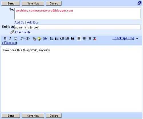 Redacte un mensaje en su cuenta de correo electrónico y enviarlo a la dirección que usted creó. La línea de asunto se insertará como título. Cualquier formato (como negrita o cursiva) aparecerá como se muestra en la pantalla de redactar: