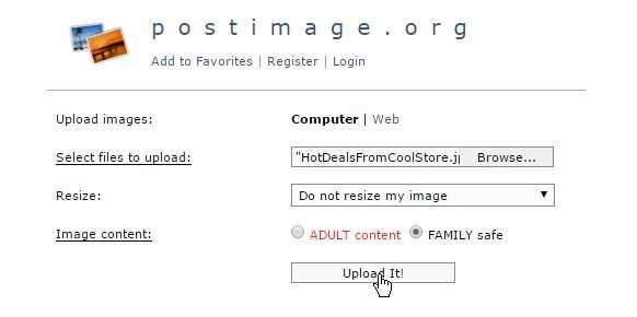 Sus ofertas deben estar disponibles a través de internet. Hay varias soluciones y el elegido aquí es Postimage.