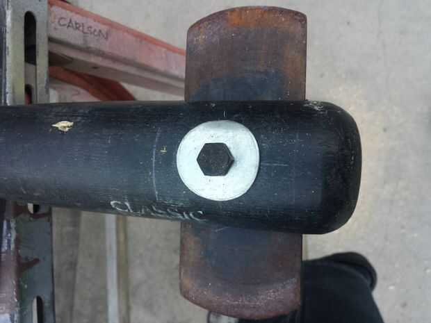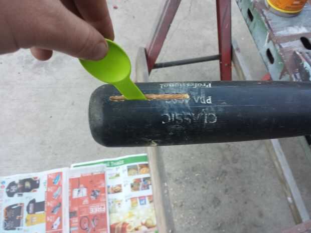 Después de que los agujeros han sido perforados listo poner todo junto. Montar las piezas y asegúrese de que todo quede como debe antes de comenzar a pegar. Si todo se ajusta a derecho desmontar todas las piezas, que por última vez. Usando un paño húmedo humedezca la superficie de la hoja de la bordeadora, luego aplicar el pegamento gorila en el interior del agujero oval en el palo. Prueba y unte el pegamento gorila uniformemente en el interior de ambos lados. Con la humedad de la hoja y el interior del palo cubierto con el pegamento gorila Inserte la cuchilla en el agujero y ponga las arandelas en ambos lados del palo y poner el perno a través del orificio. Apriete el perno y deje que el pegamento fijar. El pegamento gorila ampliará y llenar vacíos en el orificio y fije la cuchilla en su lugar.