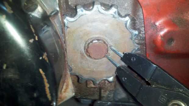 Una vez fuera de la cadena, coge un par de alicates de presión. Voy a cambiar de un piñón de 16 dientes que un piñón de 14 dientes. Se verá un anillo elástico en el piñón. Simplemente ampliar el anillo elástico que sostiene la rueda dentada para el eje estriado y quítela.
