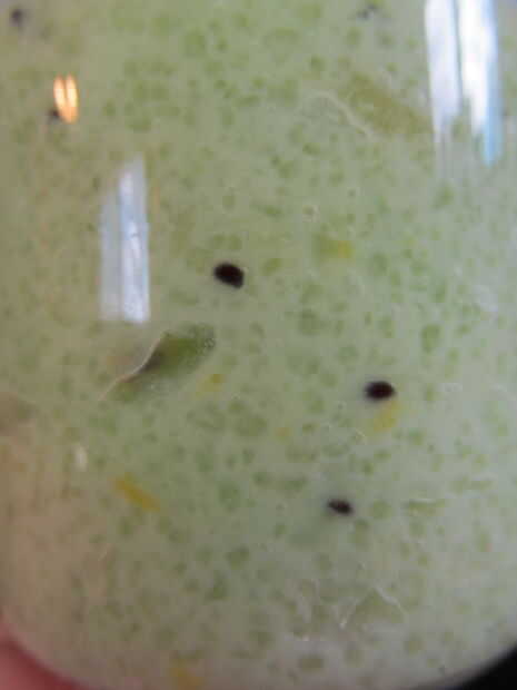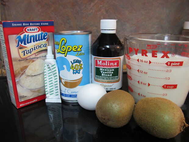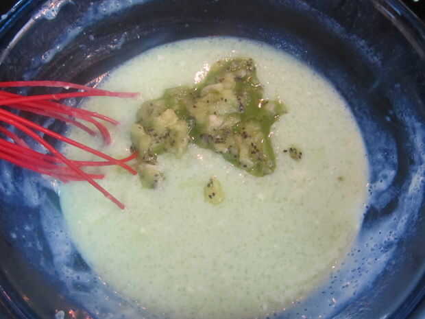 Una vez que esté cocido retírelo y agregue los kiwis y unas gotas de colorante verde. (Si desea, agregue su vainilla)
