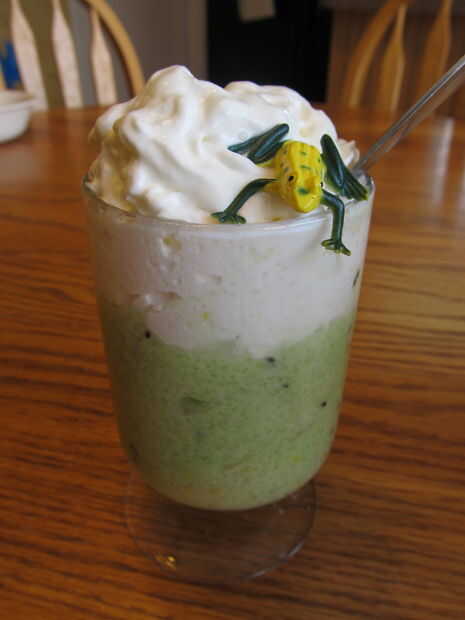 Servir de mina. Moteados en vasos y remata con alguna crema de látigo y una rana de plástico. Mis hijos les encantó! Eran todo sonrisas y risas! Creo que los sabores juntos son deliciosos también. El coco complementa perfectamente la acidez de la kiwi.