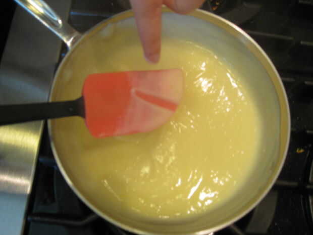 Seguir revolviendo hasta que el pudín esté lo suficientemente espeso para cubrir la espátula y deje una línea limpia cuando tire el dedo a través de él. Retirar del fuego y vierta inmediatamente a través de un tamiz en un recipiente limpio.