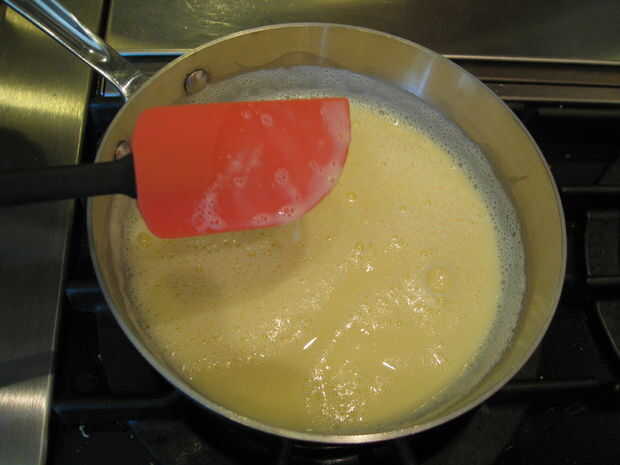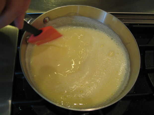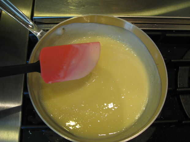 Después de unos minutos te darás cuenta la mezcla comienza a espesar. Utilice la espátula para remover todas las partes de la olla bien y constantemente. Puede comenzar a burbuja, sólo seguir revolviendo.