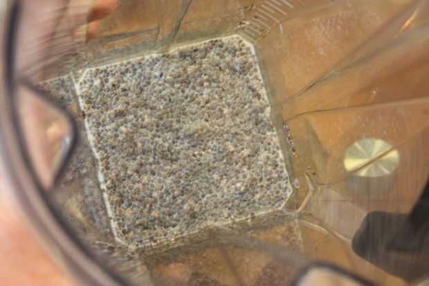 Poner la semilla de chía en la parte inferior de la licuadora y agregar 1/2 taza de leche de coco. Permite que la semilla de chía tomar leche de coco y ser gelatinosa, por lo menos 45 minutos, pero usted también podría dejar empapando más.