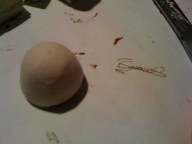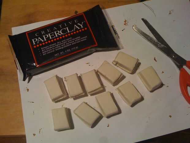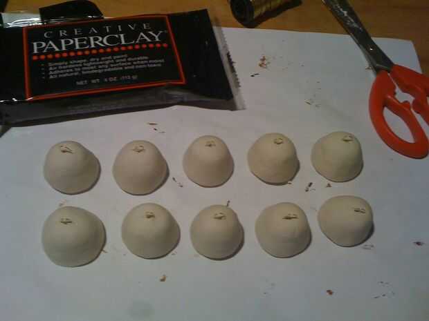 Cortar el paquete de arcilla de papel 10 piezas como se muestra. Forman cada pieza en forma de pudín áspera. Para cada pudín, suficiente alambre para hacer un lazo - será colgar el adorno de la cinta. Para hacer el lazo, doble el cable en medio y trence ambos extremos del cable y les voltear hacia arriba, como se muestra (por lo que el cable no sale fácilmente el budín). Incrustar el bucle del cable en el pudín.