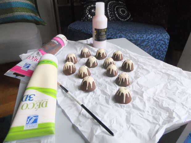 Los postres en marrón de la pintura y luego pintar la bechamel encima de ellos. Cuando seque, pintar con barniz. Cuando el barniz esté seco, enrolle el acebo en bucle del cable de pudín, con el sobrante de alambre. Una cinta para colgar el pudín del hilo de rosca.