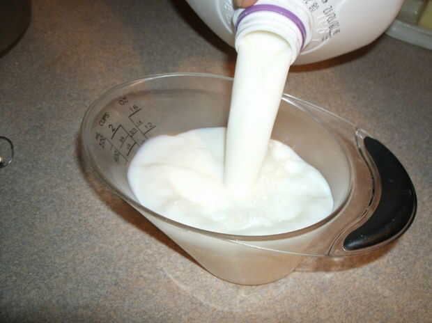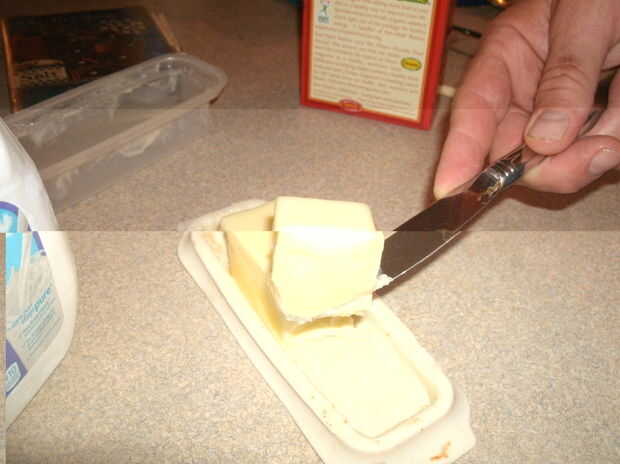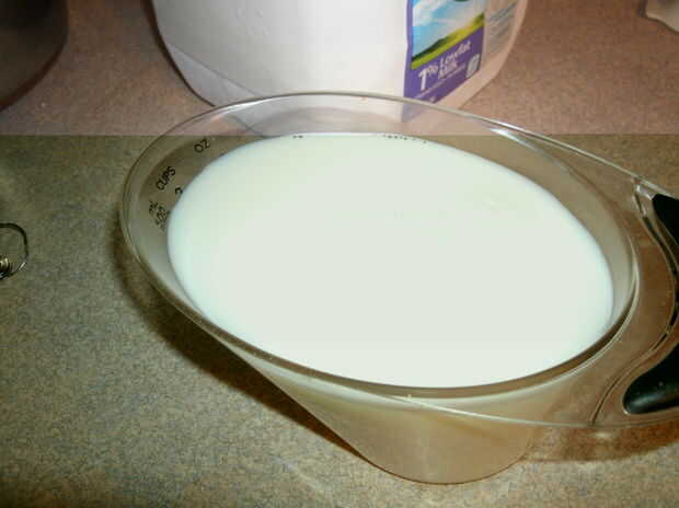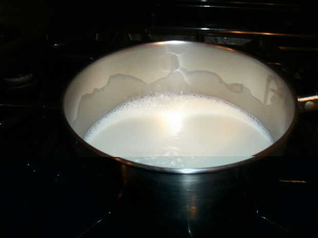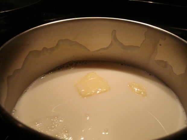 Primero se precalienta el horno a 350 grados. A continuación, obtener su medida de líquido y verter dos tazas de leche. Luego, vierta la leche en la olla y ponerlo en la estufa en alta. Ahora añadir 1/4 taza de mantequilla a la olla. (Gire la estufa apagado cuando la leche está escaldada. a.k.a hirviendo.)