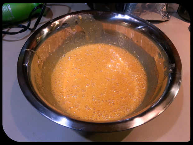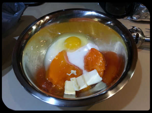 Poner la mantequilla (ahora averiguar por qué necesita para ser ablandado), el azúcar, el caqui de la carne (véase el cuadro por la forma fácil de hacerlo, básicamente sacar con una cuchara grande) y el huevo en un tazón y mezcla con la batidora de palo hasta que quede suave. Si la mantequilla fuera frío, pegarse a la licuadora como locos.