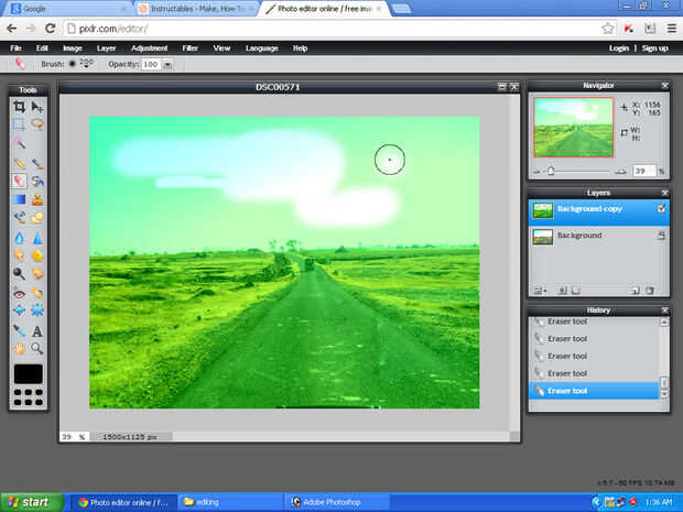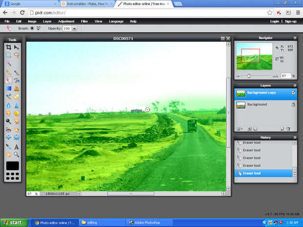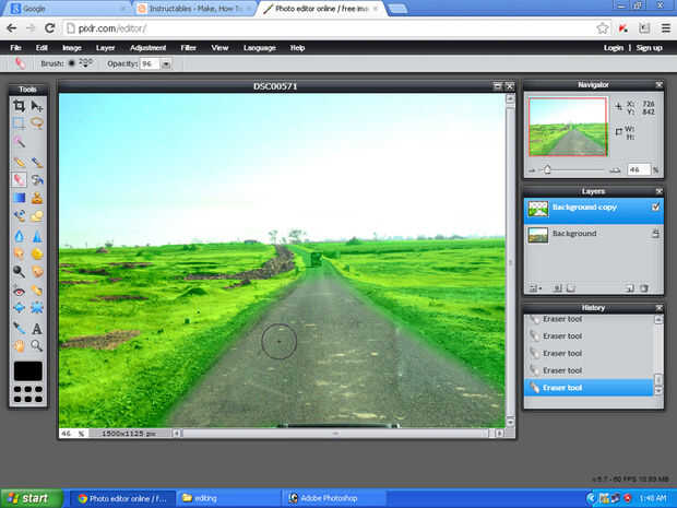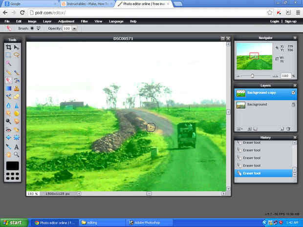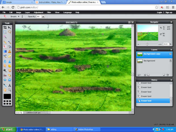 Borrar duplicado (copia fondo) imagen excepto zonas con hierba y árboles.