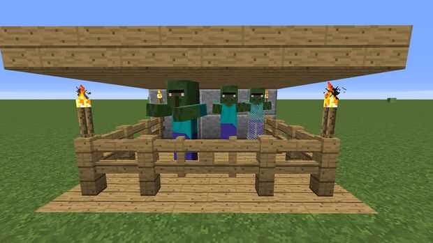 Encontrar a 2 o más zombies aldeano (el de uno con la nariz grande) y colocarlos en una jaula con un techo. No hago lo que hice, deben mantenerlos en jaulas separadas para la seguridad.