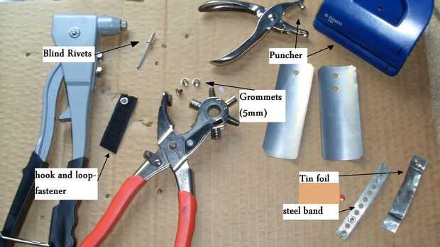 Antes de iniciar conexión necesita agujeros. Por ello utilice un golpeador o un carril especial bin. El diámetro del orificio debe ser mayor (1mm) que el diámetro del ojal (5mm). Esto es necesario porque las arandelas de ajuste mejor y las piezas flexibles hacia los demás. La conexión de las piezas funciona bien con ojales (se llama los ojales?). Para conexiones más sólidas, especialmente entre los pedazos de lata y la banda de acero, remaches ciegos. La banda de acero le ayuda a mostrar algunas partes como el casco o los componentes de hombro.