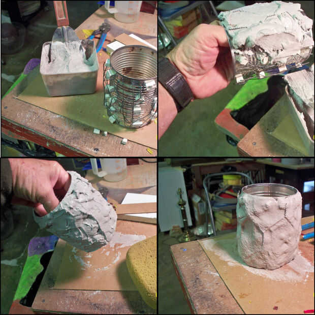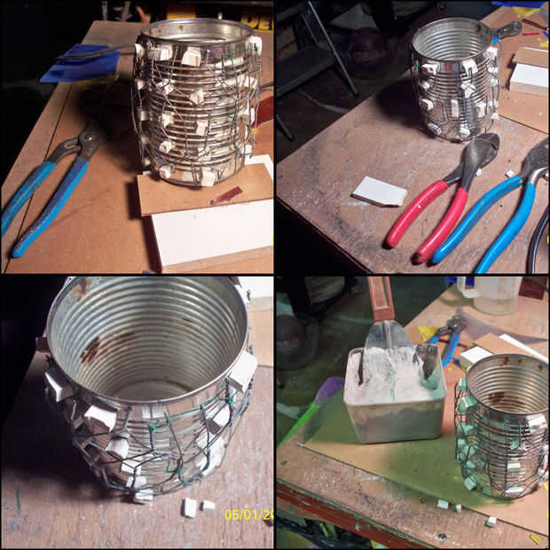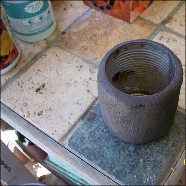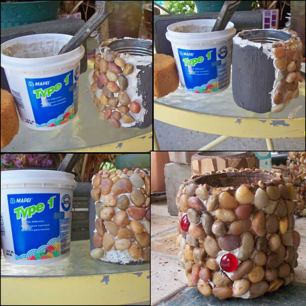 En este poder, quería una circunferencia más grande que la poder sí mismo, así que subió con un método para aplicar una capa más gruesa del material. Básicamente, primero pegué algunos trozos de azulejo sobre la lata. Alrededor de estas piezas, apliqué alambre de pollo, al igual en listón y yeso funcionaría. Luego, el mortero sistema azulejo fue había aplicado a esta rejilla soporte de alambre y deja secar. Una segunda capa de lechada con arena negra fue extendida sobre toda la superficie y alisar con una esponja húmeda. Esto le dio una capa exterior muy suave y uniforme a la que después sería Ate las piezas de azulejo. Para ello, usé el pegamento del azulejo regular. Luego, los azulejos se aplican, la pieza se permite curar al menos durante la noche, luego los azulejos pueden instalarse con lechada.