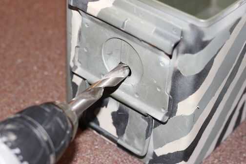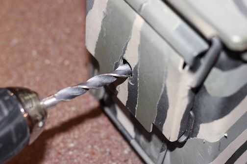 4. interruptor de 3/8 "Taladro broca y taladro un agujero en el recipiente usando la marca que creó en el paso anterior como su centro. Como antes, asegúrese de que el taladro esté en el nivel. Usted puede encontrar más fácil comenzar con un poco más pequeñas y moverse a bits sucesivamente más grandes hasta llegar a 3/8 agujero para el pasador de horquilla.