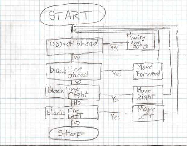 Os adjunto una foto que muestra parte del diagrama de flujo para este robot. El diagrama de flujo muestra la lógica para el robot de seguir la línea negra. Dependiendo de donde la línea negra, el robot se impulsar, mover hacia la derecha o hacia la izquierda. El robot responde a las preguntas en el diagrama de flujo de control con el sensor de luz. El diagrama también muestra la lógica para comprobar si un objeto por delante. Si el sensor de ultrasonidos ve un objeto, el brazo moverá 190 grados para golpear el objeto fuera del camino. Entonces, el programa vuelve al principio. Así, si el objeto está todavía en la forma, el brazo se moverá otra vez. Si no hay ningún objeto, entonces el programa se trasladará a buscando la linea negra y decidir dónde moverse.