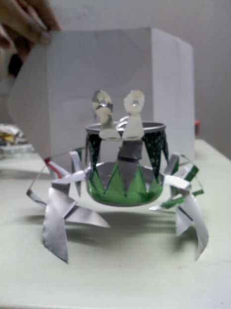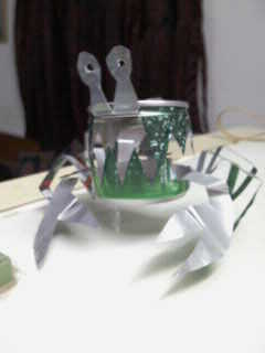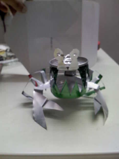 esta criatura gatea hacia la luz, con sus mejillas sensibles. Puede dirigir su camino lanzando un rayo de luz en él. Está basado en un Kit de Velleman y modificado para requisitos particulares con una capa en forma de cangrejo para darle una aparienc