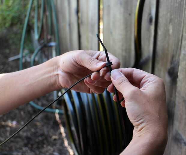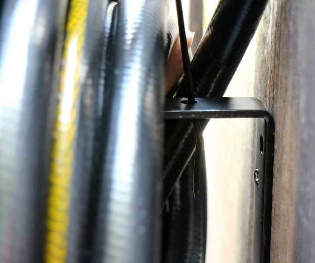 Conecte dos abrazaderas de plástico para hacer uno largo. Puso el empate a través del orificio en la parte posterior del brazo de soporte y lazo alrededor de la manguera y a través del agujero frontal. Cinche la amarra firmemente, sujetar la manguera en su lugar en el soporte.