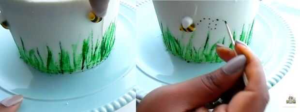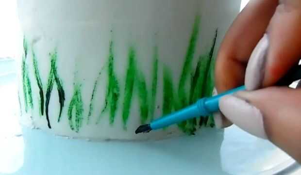 Sumerja el pincel en el verde gel colorante y pincel directamente sobre la torta a partir de la parte inferior y va hacia arriba. Hacer algunos filamentos de la hierba más oscura y algunos más ligeros. Pintar alrededor de toda la circunferencia de la torta hasta que la hierba es lo suficientemente espesa para tu gusto.