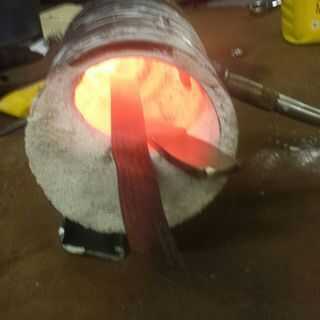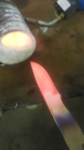 Paso 2 está disparando a la forja y calentando el cuchillo y el trozo va a utilizar para calentar el aceite de Temple. (Aceite apenas tibio es bellas. 95 grados o menos).