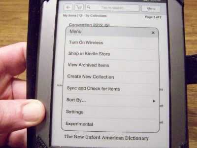 Toque o golpecito en el 1/3 superior de la pantalla y el botón del menú aparece en la parte superior derecha. Tuve que aprender que el menú que aparece le ofrece diferentes opciones según la página que está viendo. Si ya han enterrada abajo de un nivel o dos en las opciones del menú, el menú en ese nivel será diferente de lo que era en la página de apertura. Esto parece ser una cosa pequeña y obvia, pero puede confundir durante los primeros días de ser propietario de un Kindle. Si estás perdido, pulse el botón de inicio en el centro inferior del bastidor. Parece que cuatro líneas negras cortas. Después de unos cuantos usos, usted empezará a aprender qué opciones están enterradas en qué nivel de menú.
