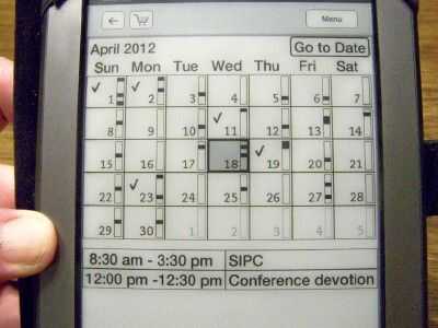 7 dragones hace un calendario por 99 centavos. Es más engorroso de usar que el calendario de mi portátil, pero permite todas las características del calendario habitual. 7 dragones ofrece tutoriales en vídeo en línea sobre las características del calendario y en sus otras aplicaciones para el Kindle. Mi única queja sobre el calendario es que mi batería necesita recargarse mucho más a menudo después de la instalación, incluso después de apagar "" la función de vacaciones. Los 7 dragones calendario está disponible a través Kindle Store de Amazon. Si el calendario no responden tan bien como debería, yo cerrarlo y abrirlo de nuevo. Parece ayudar.