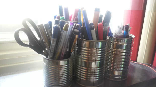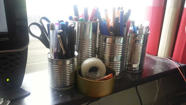 Tenía mucho de plumas ahí cada vez que tenían oportunidad de estar en el camino pero nunca encontró una cuando necesitaran. Así que empecé con uno puede pero rápidamente se dio cuenta que tenía muchas plumas y cosas así que solo seguí agregando las latas. Pero puesto que yo quería que ellos todos juntos compré algunos imanes de neodimio y ponerlos entre las latas. Los imanes son muy fuertes y así que estos son todos pegados como uno y podemos cambiar la configuración cuando quiera.