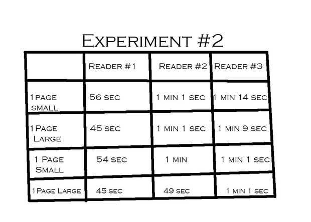 El resultado de este experimento es que tarda más en leer una página de letra pequeña porque tiene más palabras en él.