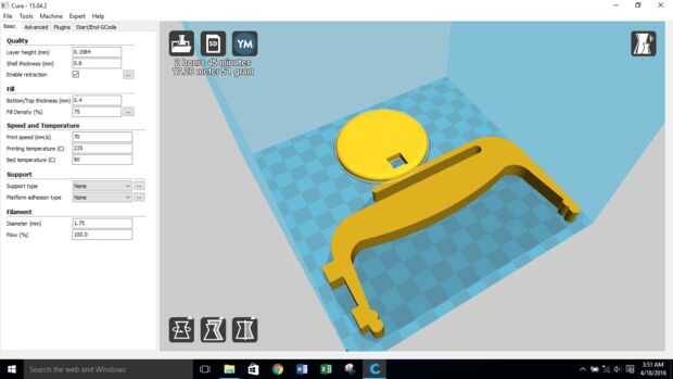 Yo uso Cura como una máquina de cortar. La configuración que estoy usando se adapta a un Metal Simple de PrinterBot. Los indicadores sólo es necesario dar esta impresión son para activar el ventilador de refrigeración off (para evitar deformaciones) e imprimir en una razonablemente alta densidad porque usted va flexionando los brazos para bloquear la lata en lugar.