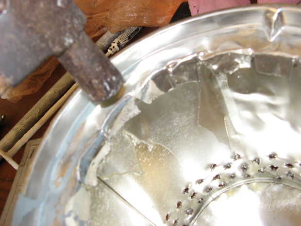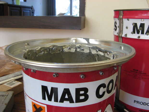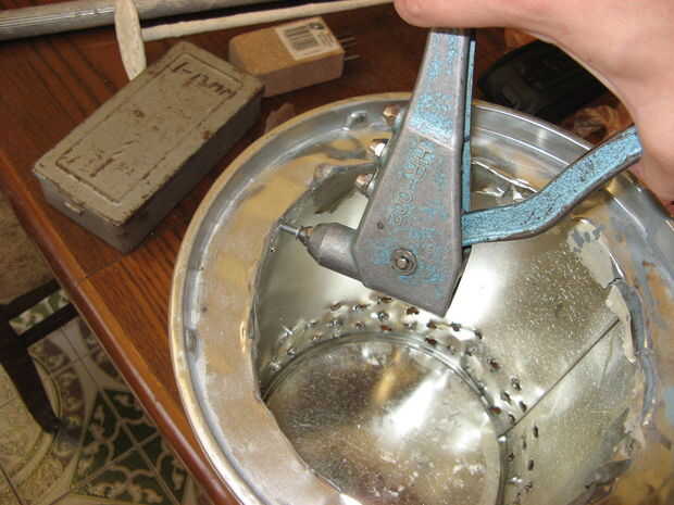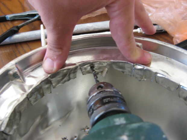 C. perforar un orificio para el remache a través de una pestaña y remache. Repita en el lado opuesto de la can. Repita el wth fichas a medio camino entre pestañas clavadas. Continuar hasta que todas las lengüetas estén rivited. Desea ajustar cada lengüeta antes de perforar.