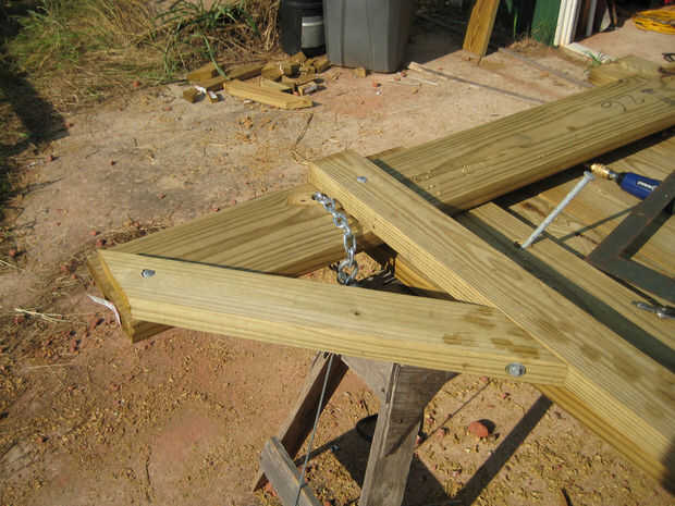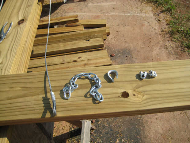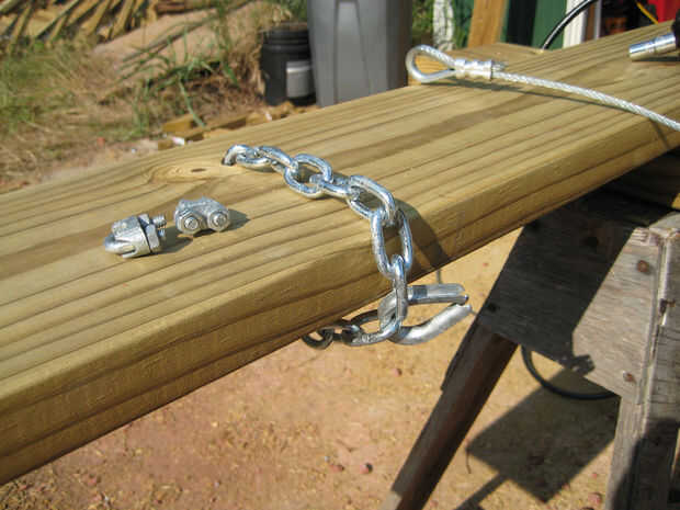 La conexión entre los tirantes (cable de aeronaves galvanizado 3/16 Avos, carga de trabajo de 850 lb) y la viga es un problema. Uno de los extremos de la Liga debe ser ajustable para permitir como correcciones construidas a la tensión y de tal modo la forma del puente. La conexión ideal sería una anilla a través de la vigueta con un torniquete entre el cáncamo y el cable de la liga. El problema con esa solución es el gasto - cuando necesita 74 de todo, forjado o incluso soldadas 8 armellas son caros, y así son los tensores. En cambio, elegí hacer 1 en agujeros en las vigas de aproximadamente 2 en de la parte inferior y a las afueras de la barra de apoyo vertical. A través de este agujero rosca cadena 3/16 Avos brillante bobina prueba con una carga de trabajo de 800 libras. He roscado un guardacabo 3/16 Avos a través de eslabones de la cadena final, entonces el cable a través el dedal y finalmente sujeta los dos extremos del cable con los dos clips galvanizados de 3/16 Avos. Si hago otro puente, podría probar otro enfoque, pero esto funcionó muy bien, si un poco engorroso para construir y ajustar una vez el puente es para arriba.