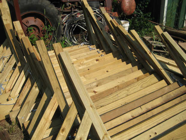 Los tirantes de cable de avión y la cadena plateada fueron cortados a la longitud con una sierra de corte fricción. 74 piezas de cadena, todos la misma longitud (16 enlaces) y 74 longitudes de cables, 4 de cada longitud excepción sólo 2 para el centro Liga, (cables catenarios 2, cada una de ellas con idénticas dimensiones cada camino desde el centro). La longitud de los tirantes se calculó en la hoja de cálculo para un 6 en arco el puente así como suficiente cable para guardacabos en ambos extremos, la compresión en el extremo superior y los dos ganchos en el extremo inferior. Los tirantes se instalaron a las dimensiones calculadas en la hoja de cálculo de la parte inferior del cable del catenario a la parte superior de las vigas.