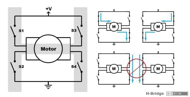 El circuito está formado por cuatro interruptores que completan el circuito cuando se aplica en parejas. Cuando se cierran los interruptores S1 y S4 el motor obtiene poder y giros. Cerrando S2 y S3 el motor recibe energía y gira en sentido contrario. Cerradas que S1 y S2 o S3 y S4 deben nunca ser juntos para evitar un corto circuito.
