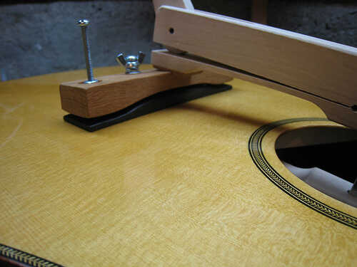 Al final, uno básicamente pega el puente a la tapa armónica y esperanzas para lo mejor. Pero hay algunas consideraciones muy importantes para hacer durante el montaje. ¿Es la caja de resonancia plana, ligeramente cóncava o ligeramente convexa? ¿Es el puente de centrado a lo largo de ambos ejes de la guitarra? ¿Cuál es la distancia a la tuerca?