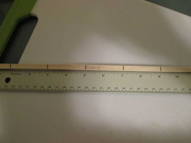 Usar una regla para marcar una pulgada en desde el extremo izquierdo de la base. Luego, marque cada dos pulgadas después de que marca. Esto le indicará la ubicación de los apoyos de celosía vertical. (Nota: Si una regla está situada al lado de la base de las marcas deben ser leídas en las marcas 1,3,5,7,9,11 y 13 pulgadas.)