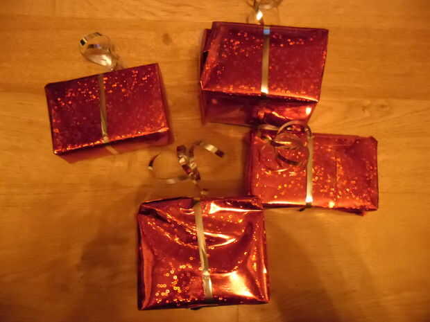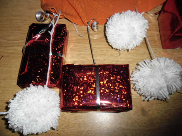Hacer pequeños agujeros en la parte inferior del puente. Lazo de un regalo para todos los otros agujeros. En los agujeros en el medio, atar un gran pompón blanco parecen como bolas de nieve. Si no tienes ningún pom-poms, echa un vistazo a mi instructable sobre cómo hacerlos.