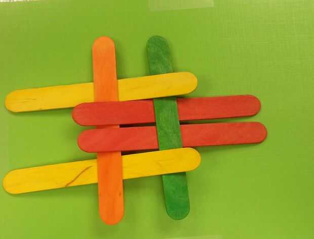 Añadir dos barras adicionales (rojo) enhebrándolas en el palo verde y el palo de naranja. Puede que necesite mantener el palo de naranja en su lugar mientras hace esto. Observe que el puente comienza a levantar en este punto de la superficie. Que continuamente tendrá el puente plano mientras añades nuevos palos, esto le permitirá añadir más fácilmente palos sin preocuparse de su puente se vuelque sobre/caer aparte. Consejo: a menudo ayuda a deslizar la palanca nueva en ángulo para comenzar con.