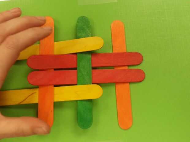 Añade un séptimo palo (una naranja) deslizando por debajo de los dos palos rojos.