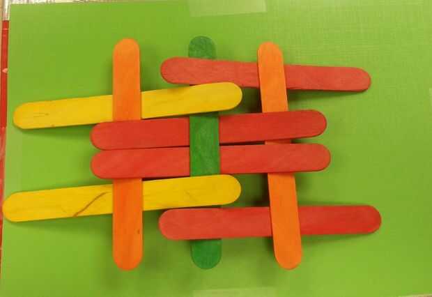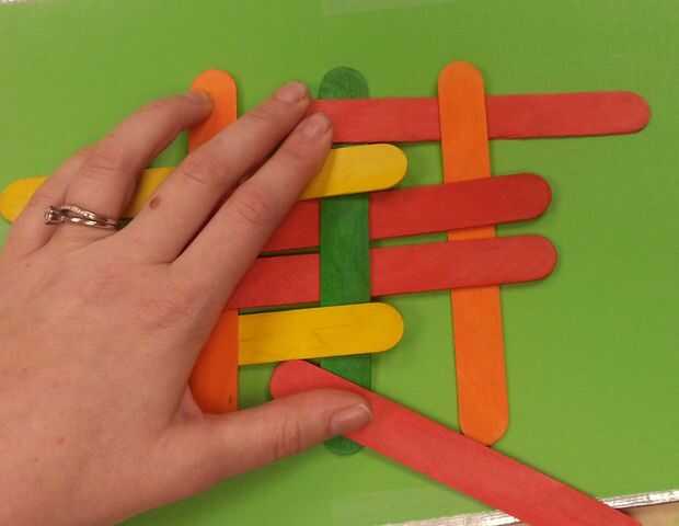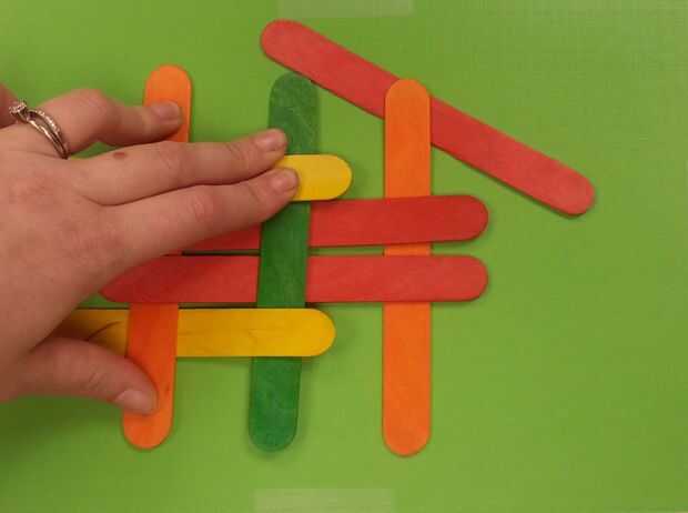 Tejido palillos 8 y 9 (rojo palillos) bajo el palo de naranja y encima el palo verde. Si te dejaron ir poco a poco de su puente después de recibir estos palillos en su lugar, si hará Levante sí mismo para que los palitos rojo hacen una plataforma paralela al suelo. Puede dejar aquí o seguir yendo a hacer el puente más largo...