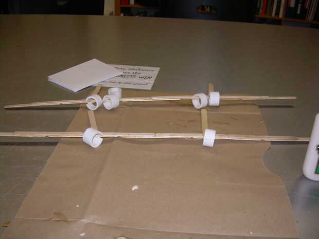 Pegan los pedazos más pequeños, para crear los principales soportes para el puente. Luego repitió el proceso y había hecho algunas piezas un poco más cortos por la parte superior.