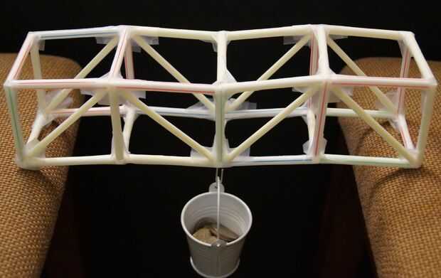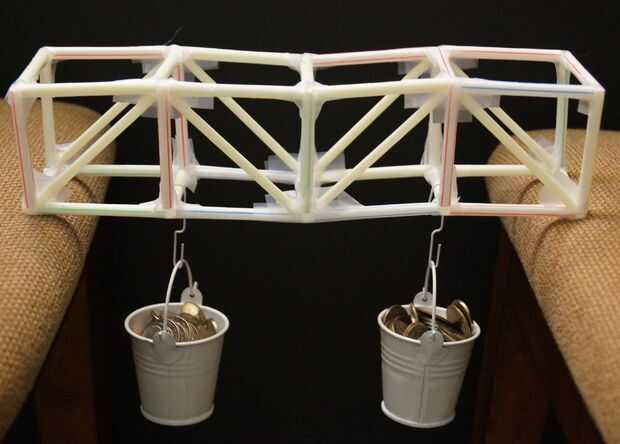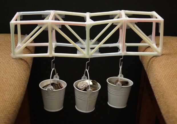 2. Colgar una pequeña taza en medio del puente (uso de la perforadora y clips de papel) y cargar con monedas, clips de papel, etc. para pesar abajo y probar su fuerza.