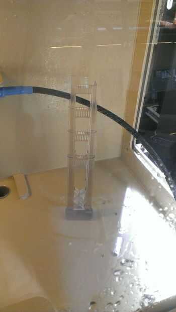 Encontré un STL limpio del puente Golden Gate a través de la web y reduce el archivo a sólo la aguja vertical. Imprimí este 6" alto y se dio cuenta que se perderían en la pieza y la relación era demasiado pequeña para añadir la iluminación imaginaba. 12" alto resultada para ser justo para mis propósitos. En el 500 de Stratasys imprimí en el ajuste rápido de impresión (60 micrones) utilizando Vero claro compuesto. Adjunto se encuentra el STL archivo - disfruta :) También en las fotos son fotos de un viaje del barco de investigación...