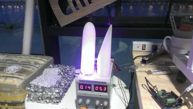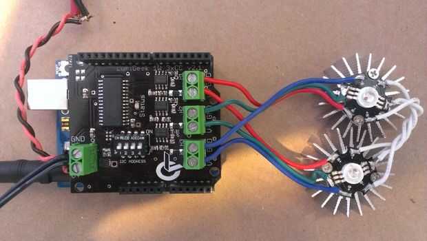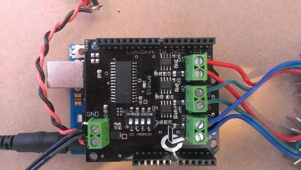 Estoy usando la Arduino UNO con el 3xCC de LumiGeek protector funcionando dos 2 1 Watt RGB LEDs (cada uno con un 1.5" disipador de calor Unido) conectados en serie. El escudo de LumiGeek gestiona la corriente para LEDs reciben corriente constante como disminuye su resistencia se calienta y no queremos fundirles. Puso a desvanecerse y el color naranja internacional de GGB, que en RGB es 240,74,0 (determinada por que el Sr. Google). Estoy compartiendo información adicional sobre el Arduino LumiGeek instalación bajo un Instructable separado; para obtener información adicional en LumiGeek ir a LumiGeek.com o https://www.facebook.com/lumigeek.