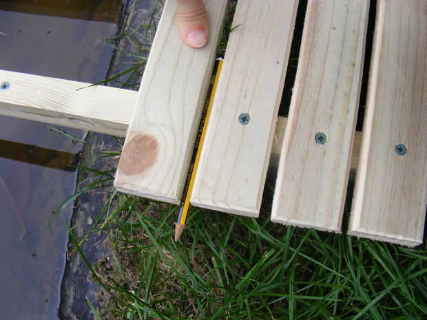 Una vez hecho esto puede empezar a colocar sus tablones. Asegúrese de que la tabla está centrada y cuadrada con el resto de la estructura, una vez que la posición es correcta taladro a través de la tabla y en el marco.