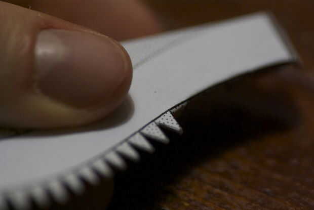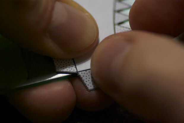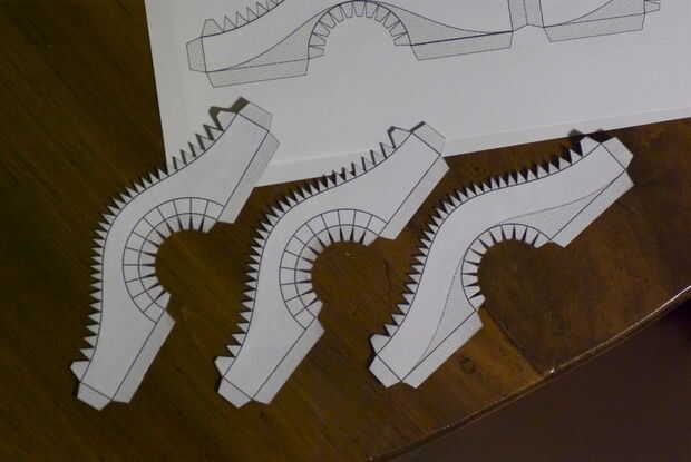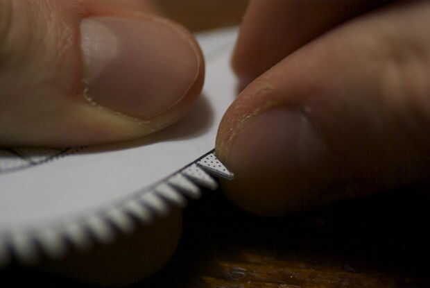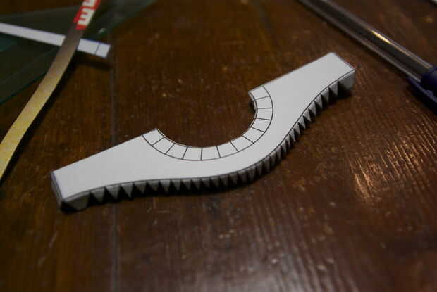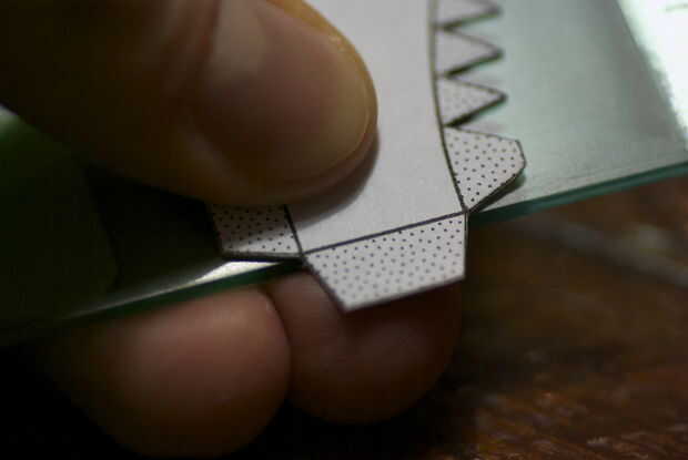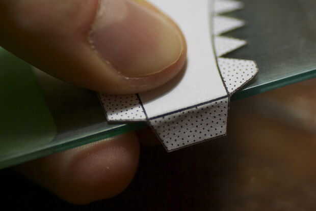 Para plegar las líneas rectas, sugiero para utilizar el borde de una regla como guía. Sostener la pieza contra el borde con la línea de plegado en el borde, luego presione con el pulgar para dejar una huella. También todas las aletas pequeñas para pegar la curva.