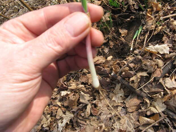 Es importante identificar plantas silvestres correctamente; Puerro salvaje tiene una daga en forma de hojas, color verde en color con un tallo rojo y blanco y un blanco extremo bulboso con las raíces en el extremo de la bombilla.